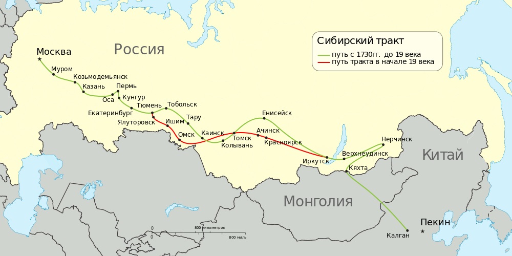 Евгений Ларин: Нитка Сибирского тракта изменялась с течением времени. Были не очень существенные изменения, но были и весьма серьёзные. Так, в начале XIX века тракт стал пролегать южнее. Вместо Тобольска и Тары он ушёл на Ишим и Омск, а дальше — что было очень важно! — в стороне от тракта остался Енисейск, потому что большая дорога прошла через Ачинск и Красноярск.
