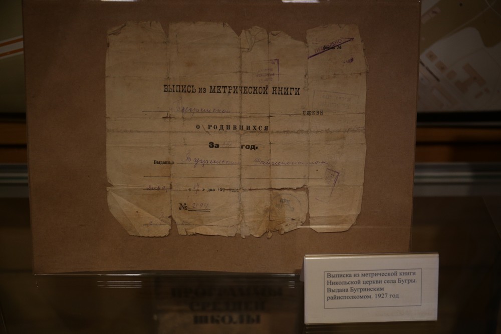 Антон Нелидов: Вот, например, выписка — так называемая выпись — из церковно-приходской книги, причём выданная Бугринским райисполкомом. Две «организации», которые трудно друг с другом соотнести. Тем не менее выписку из церкви выдал райисполком. До этого подобного не встречалось. Это поздняя находка, она ещё никаких результатов не дала. Но, скорее всего, с её помощью что-то можно будет выяснить.