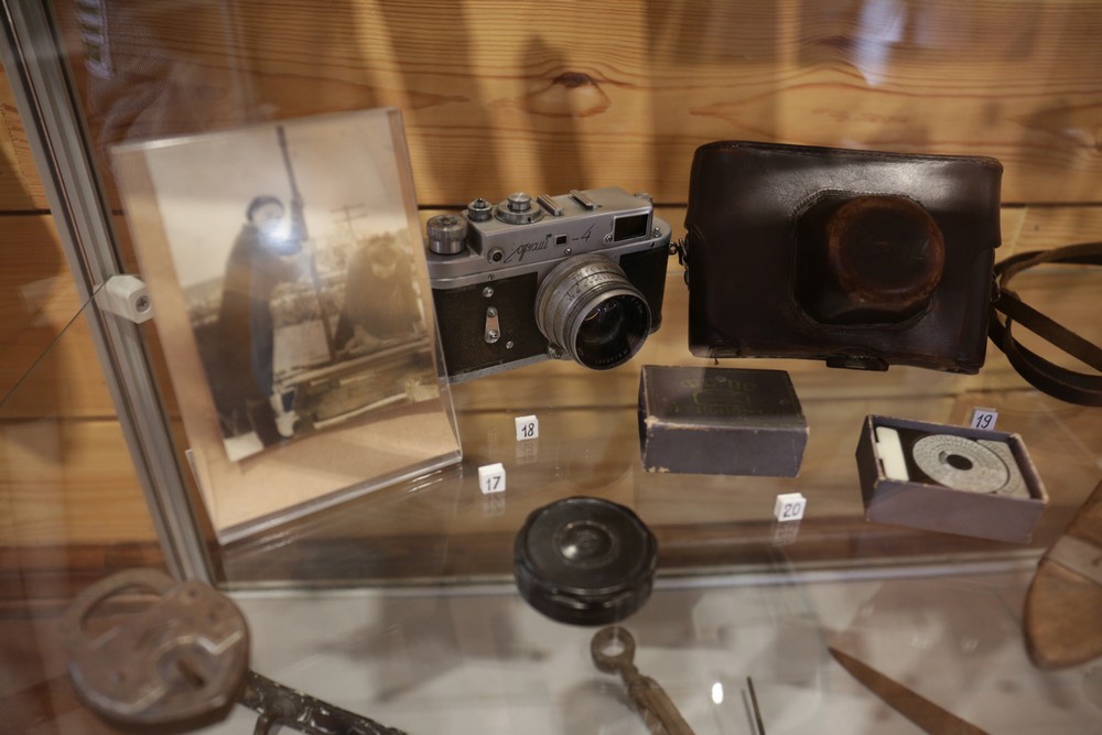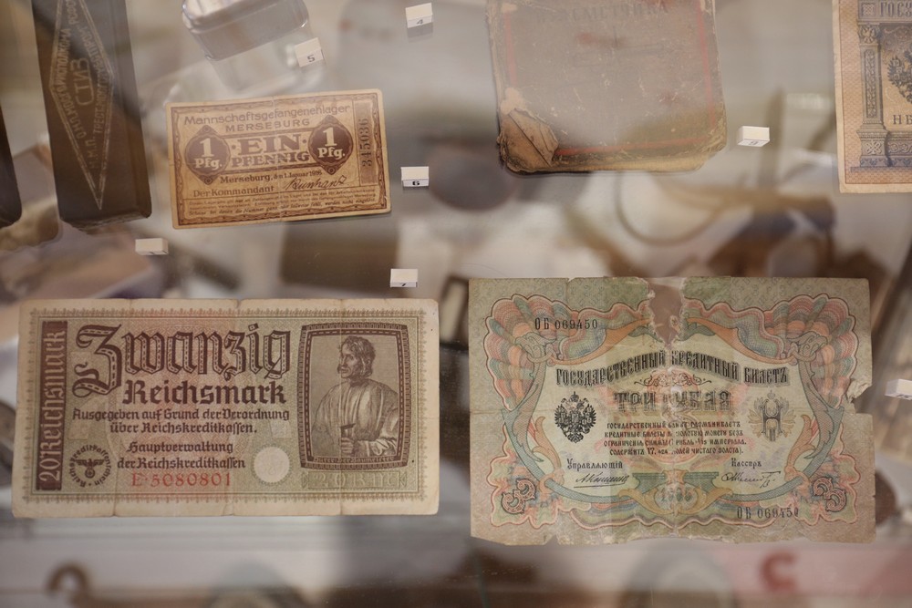 Евгений Ларин: Теперь — самое интересное: что и где находили? Среди экспонатов есть и посуда, которую по виду, кажется, можно отнести к гораздо более раннему периоду. И швейные машинки, и примусы, и деньги царского времени. Даже, как мне показалось иностранная валюта.