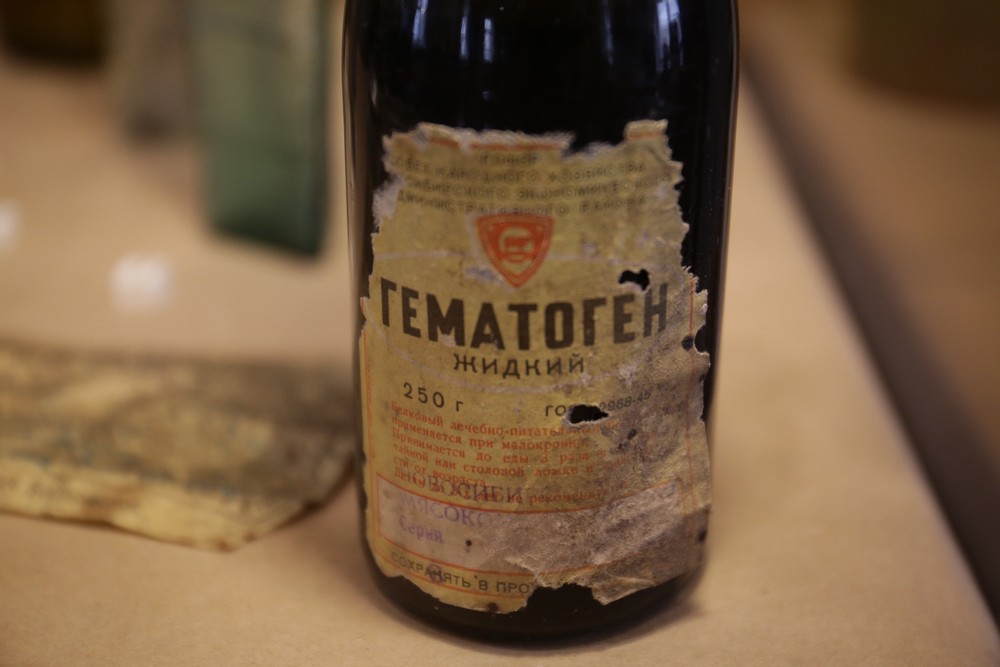Ещё из необычных находок — жидкий гематоген. Я случайно нашёл эту бутылку у себя в подполе. Что-то делал там и обратил внимание на донышко, которое торчало из земляного пола. Покрутил, вытащил бутылку с пробкой, залитой сургучом, с сохранившейся этикеткой. Датировки на этикетке нет.
