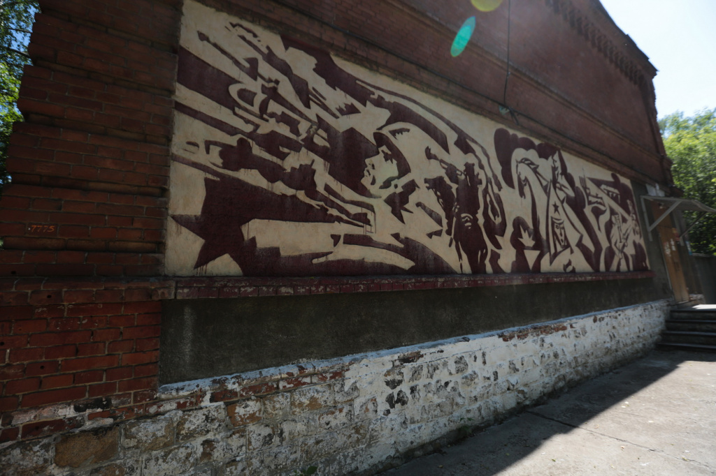 А на другой стороне этого здания был барельеф уже советского времени, созданный, видимо, хозспособом, как тогда говорили в армии, но явно человеком, имевшим хорошее художественное образование. Плоскостной барельеф по военной истории страны Советов. Здание соединяет в себе две исторические эпохи, об этом можно много рассказывать.