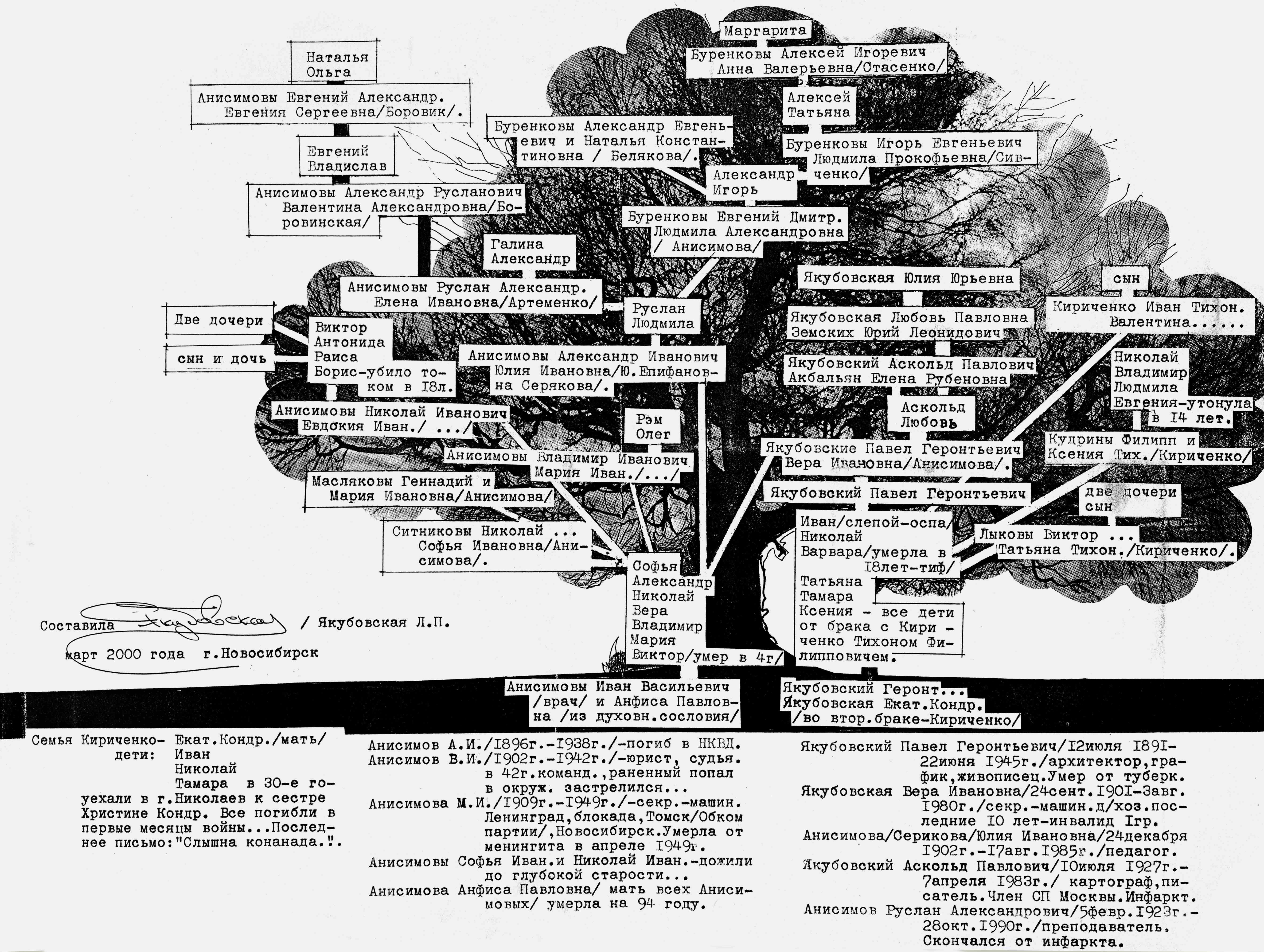 Вообще, такой жанр оформления фотоальбомов в советский период был достаточно распространённым. Но здесь мы столкнулись не просто с оформлением семейного летописного альбома, а с попыткой создания семейного древа. Любовь Павловна подошла к этому вопросу очень серьёзно, она его оформила, и это семейное древо предваряет просмотр фотоальбома и во многом облегчает его, потому что семья очень большая.