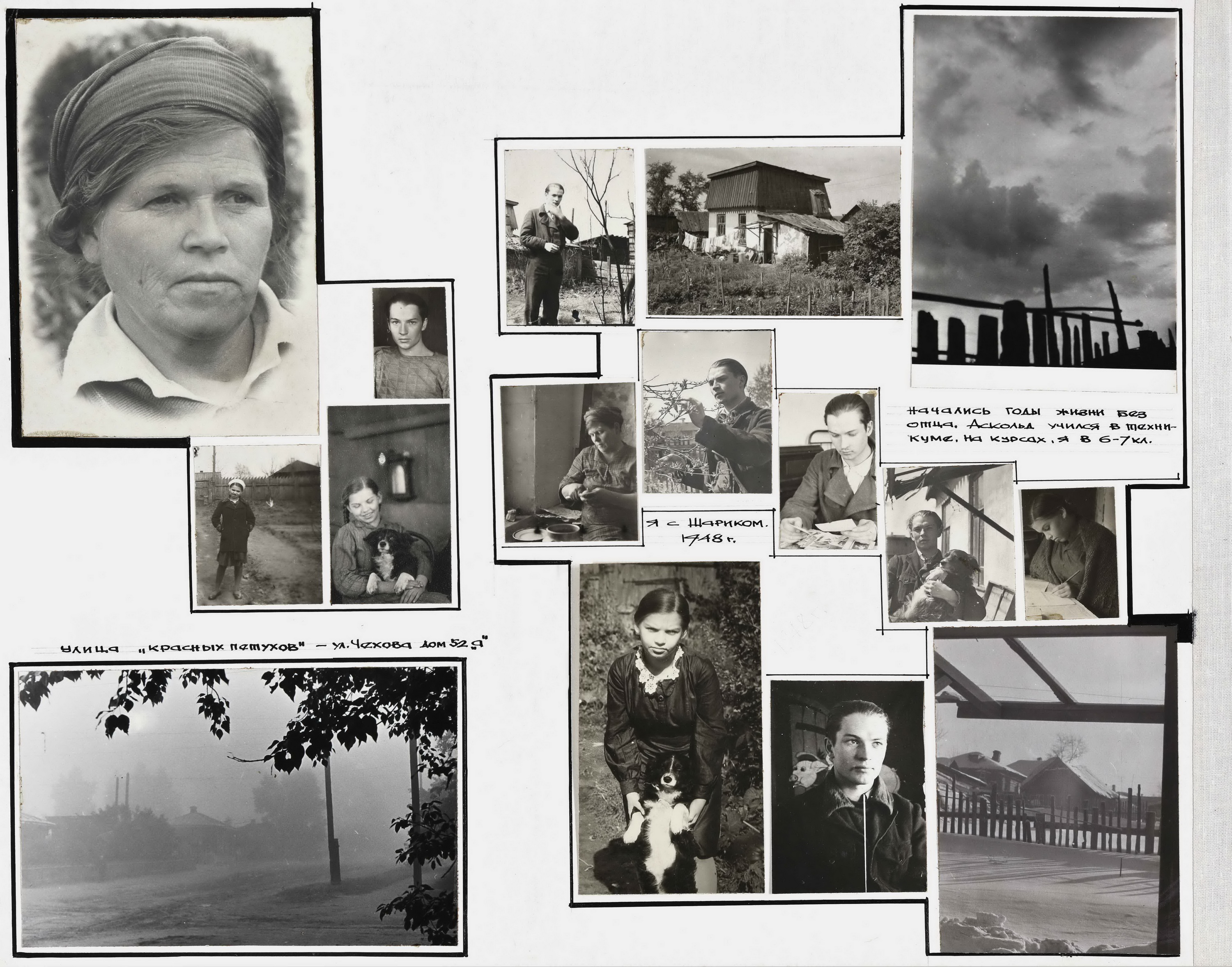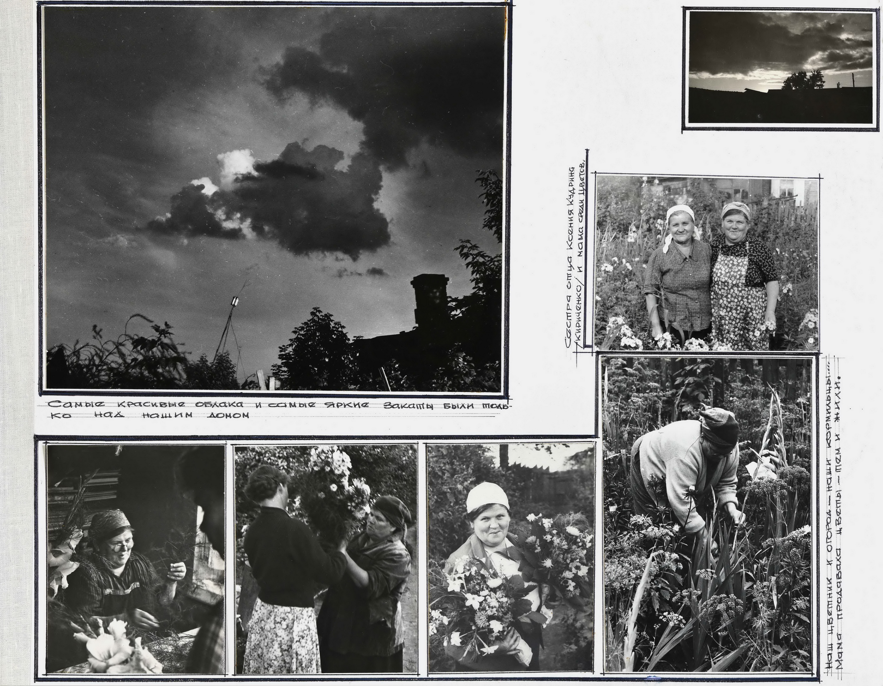 Когда мы создавали выставку, то специально не задавали какую-то определённую траекторию перемещения по залу. У нас она складывалась по-разному, мы по-разному перемещали листы с фотографиями, композиций можно было создать очень много. И те, кто посетит выставку, увидит, что мы использовали передвижные конструкции. Выставку можно смотреть по-разному, заходить с разных сторон, и с разных сторон что-то может по-другому открываться. В одном месте можно собрать всё про маму, в другом — всё про её волшебный сад-огород, где-то — про семью, которая была ещё до революции, про бабушек, про многочисленных кошек и собак. Компоновать всё это можно совершенно по-разному. Мы, конечно, хронологическую линию выдержали, но вариантов очень много. Смотреть выставку можно с любого момента, от любого момента можно двигаться вперёд или назад.
