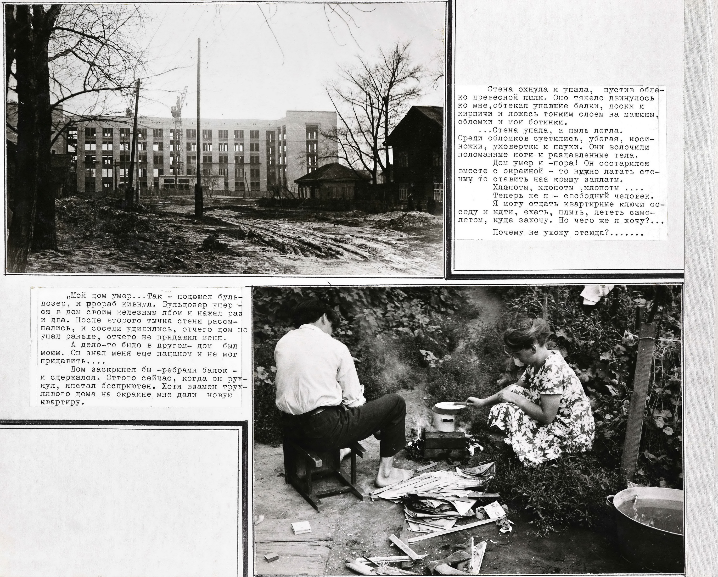 «Недавно умер мой дом. Так — подошёл бульдозер, прораб кивнул. Бульдозер упёрся в дом своим железным лбом и нажал раз и два... После второго тычка мои стены рассыпались, и все удивились, отчего дом не упал раньше, отчего не придавил меня. Прораб тоже удивился и сказал: