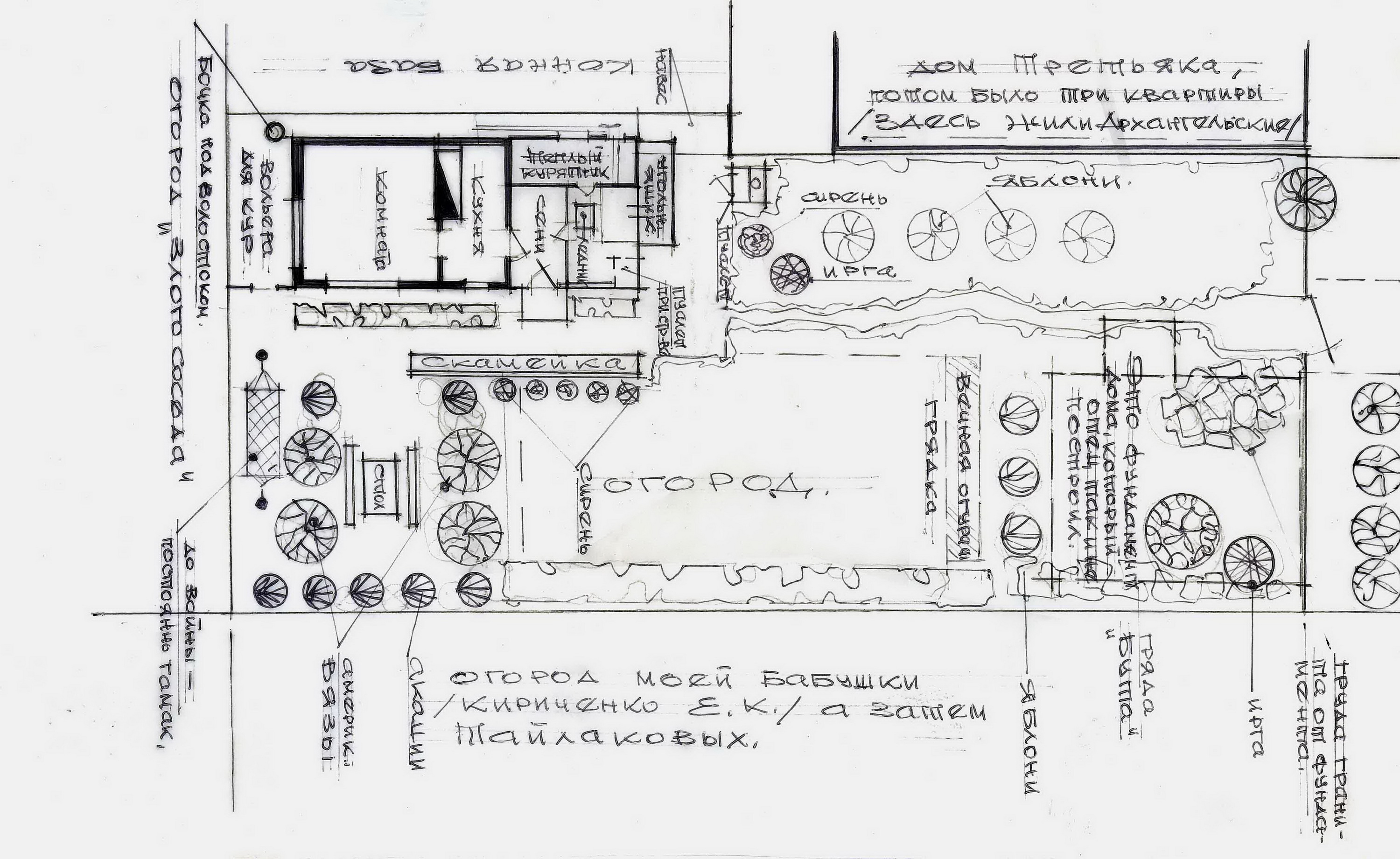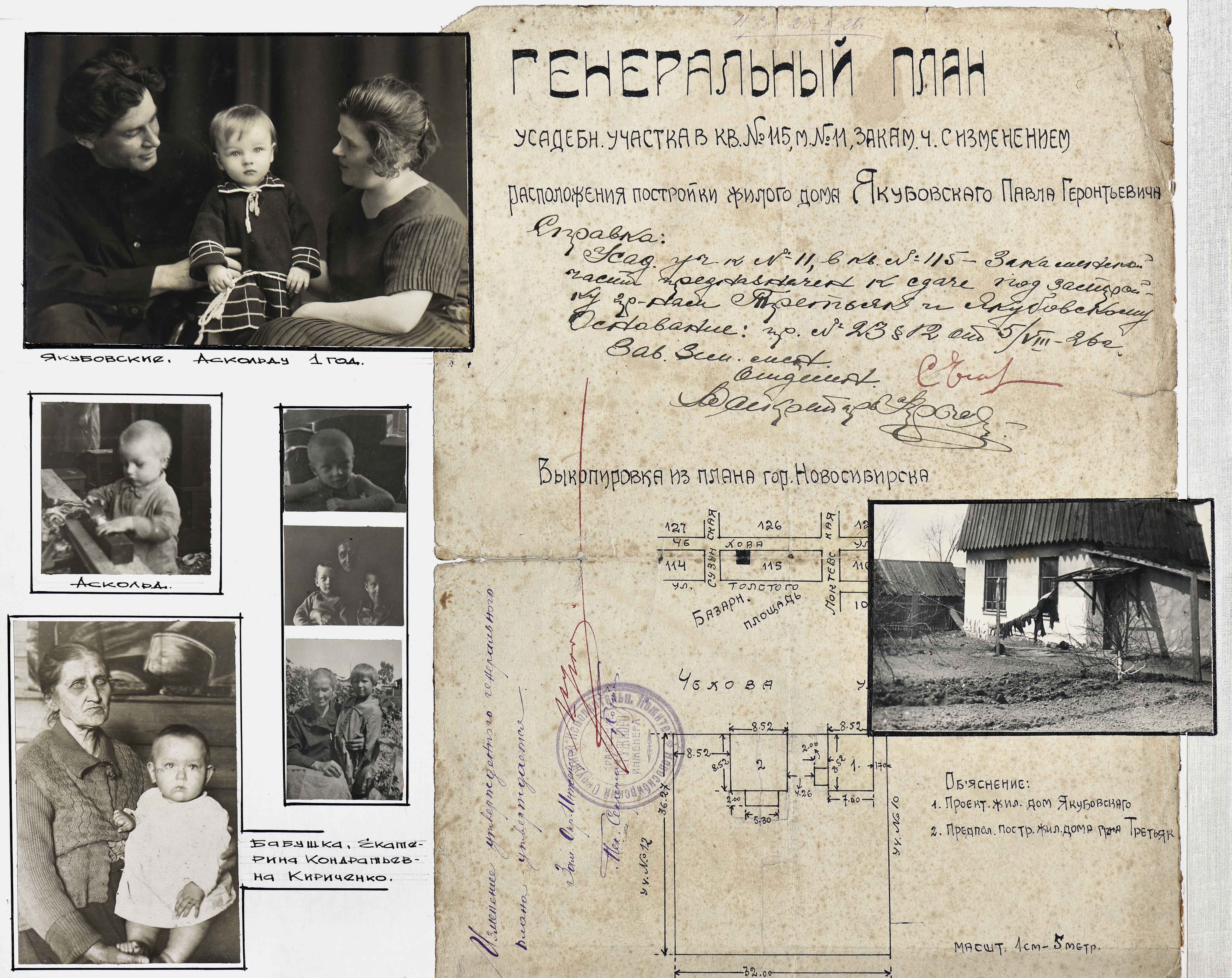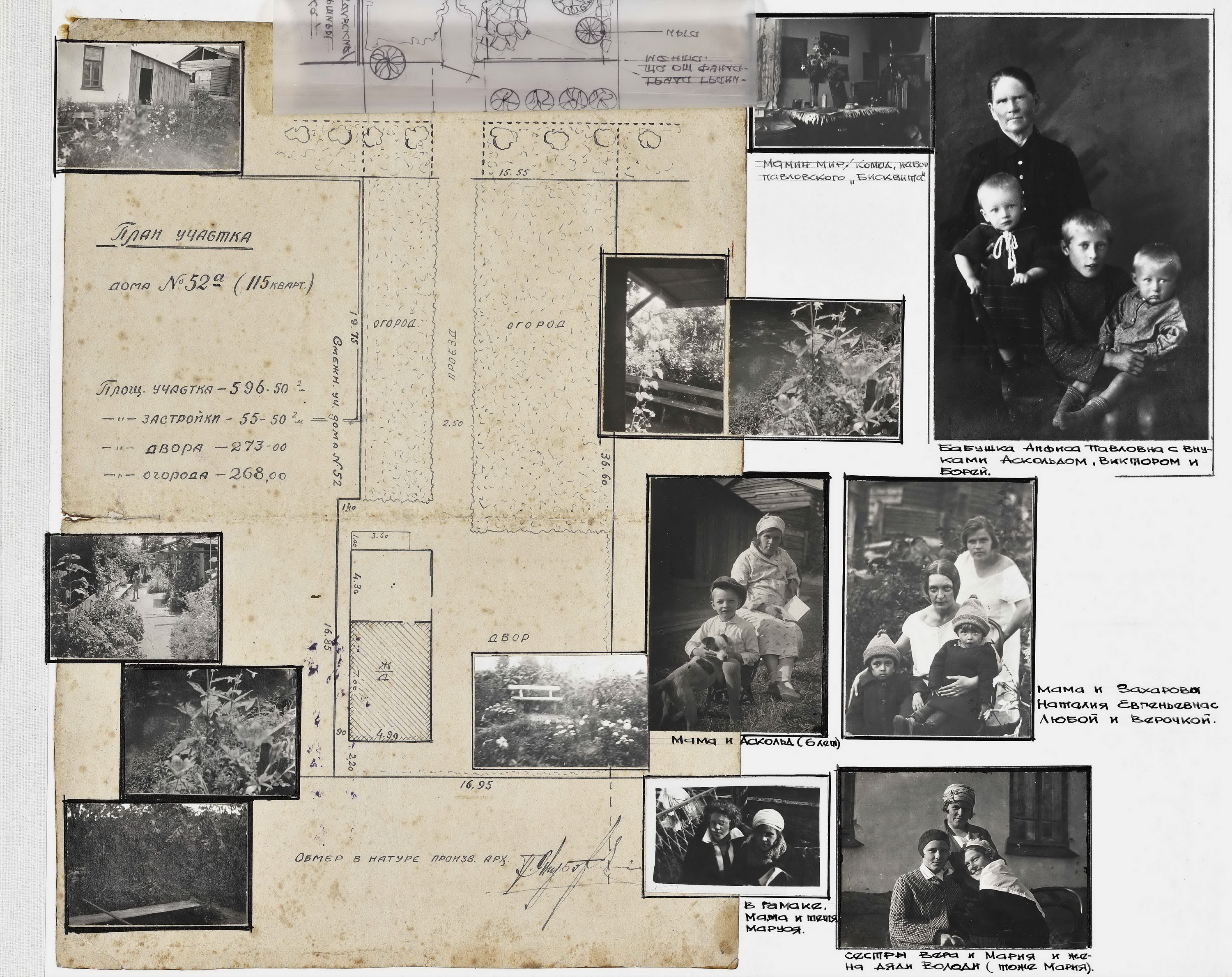 Татьяна Голубченко: Точное местоположение участка, где находился дом Якубовских, нам известно потому, что в альбоме есть документ — схема участка, который предоставлялся Якубовскому под строительство. Любовь Павловна в альбоме упоминает, что дом этот отец построил сам. Также у неё там есть замечательная схема, которая вычерчена на кальке и сверху накладывается на план участка. Из этой схемы мы узнаём, каким был уже обихоженный участок, что там было посажено, где был огород, где и сколько там росло яблонь, где стоял дом и даже где висел гамак, который встречается на фотографиях с комментарием, что гамак висел в этом месте только до войны. Всё это очень подробно вычерчено на этой схеме.