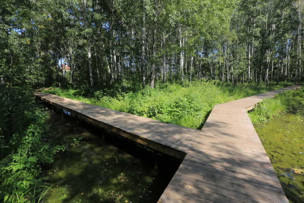 Фишкой парка, безусловно, станут необычные пешеходные экотропы, которые пронизывают всю территорию насквозь и пересекаются между собой. Они представляют собой деревянные мостки на сваях. Такие конструкции позволяют, во-первых, снизить негативное влияние человека на окружающую среду, а во-вторых, проложить дорожку в сложных условиях, например, через заболоченную местность.