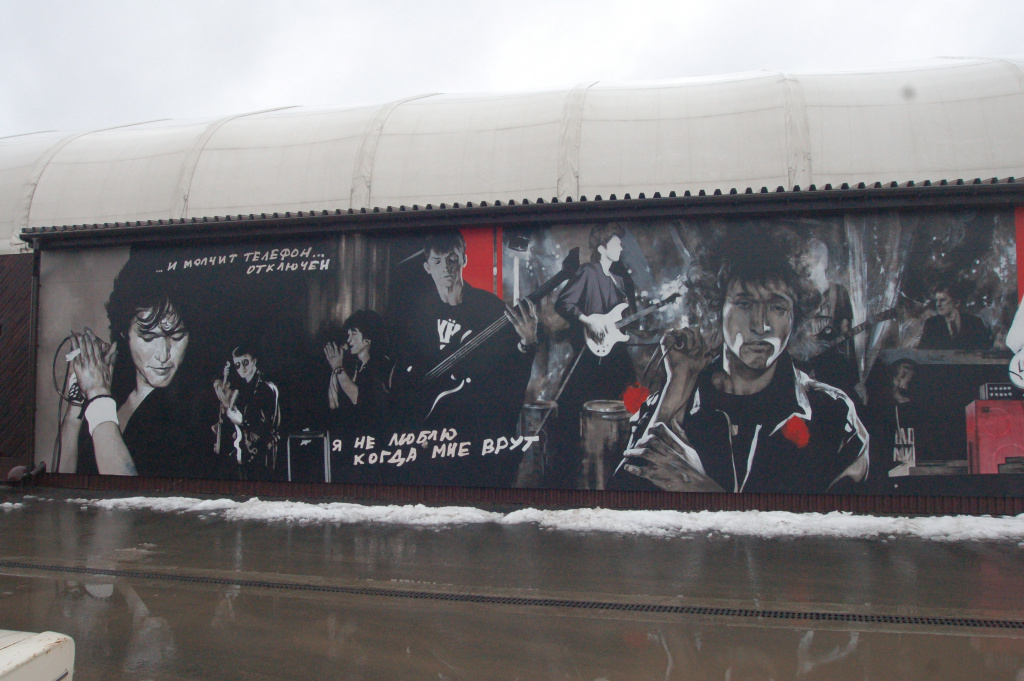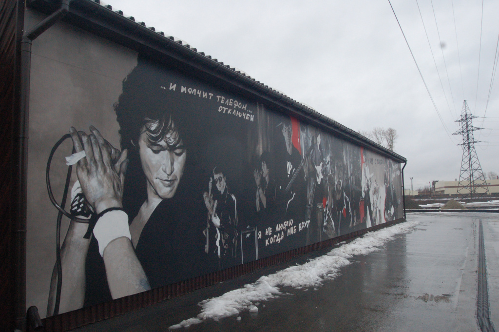 Огромный мурал на глухой стене магазина стройматериалов художник Василий Каптырев «собрал» из пяти портретов Виктора Цоя. В центре — знаменитый кадр из фильма «Асса», где музыкант исполнял песню «Перемен». Справа от него — фигура с белой гитарой. Это было 24 июня 1990 года на последнем концерте Цоя в Лужниках.