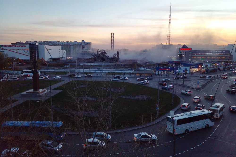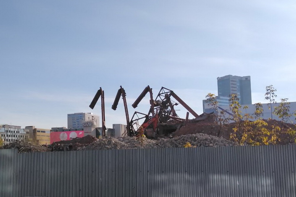 Остатки железной конструкции ДК «Сибсельмаш», которые возвышались на площади Маркса последние несколько недель, обрушились вечером 14 октября.