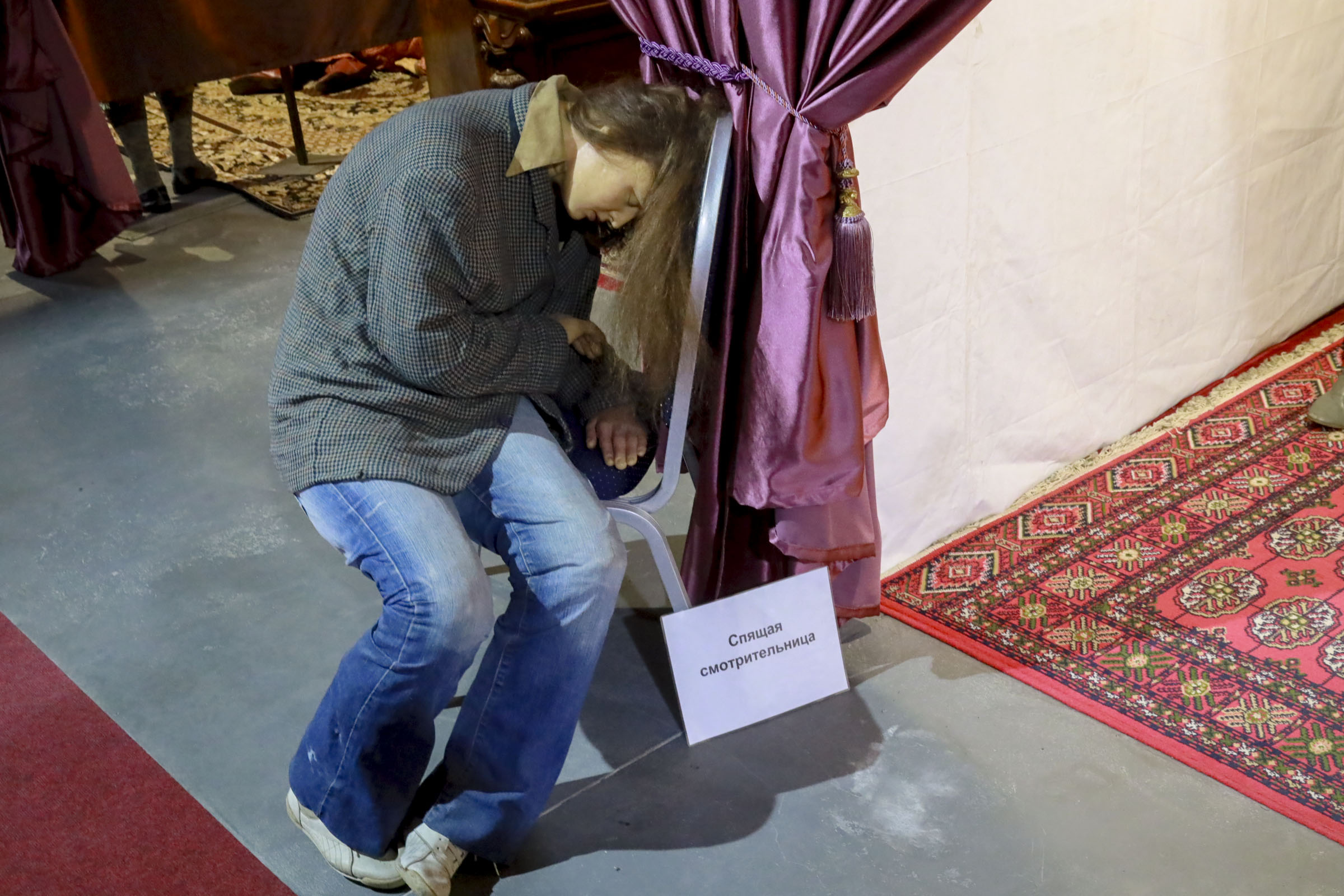 Сразу на входе вас встречает охранник. Он настолько похож на человека, что некоторые гости с ним здороваются. Рядом, у стойки администратора, расположилась мадам Тюссо — основательница известного лондонского музея. Среди других примечательных «сотрудников» — спящая смотрительница и рабочий сцены.