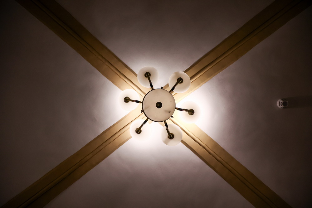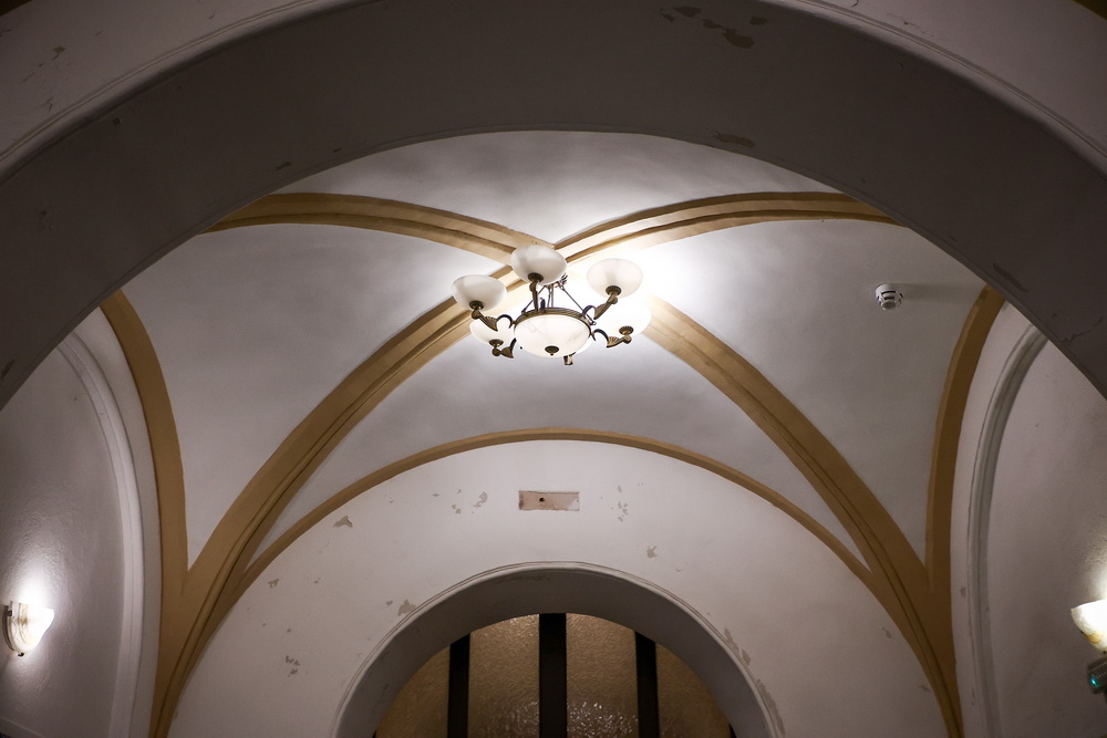 Высокий зал над центральным входом сегодня разделён на два этажа, но ещё хранит особенности первоначального интерьера.