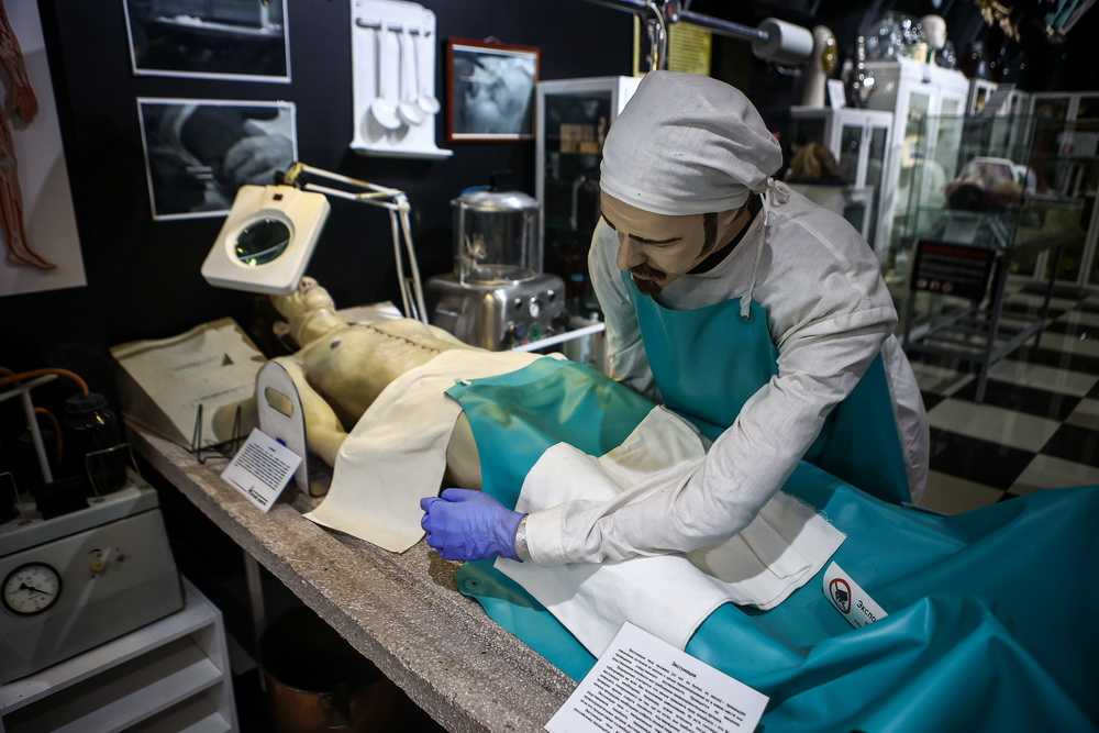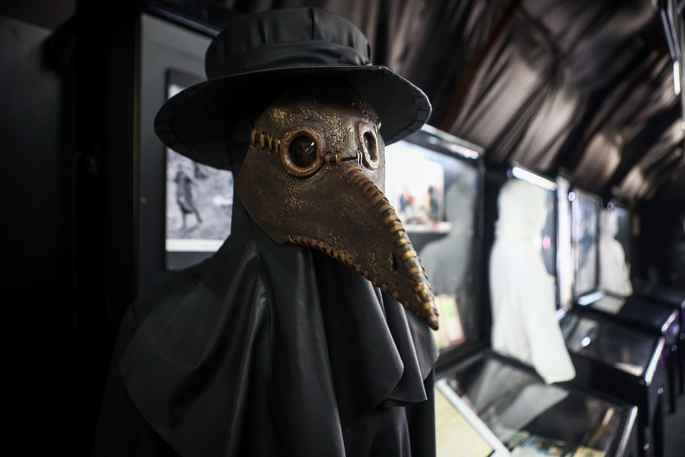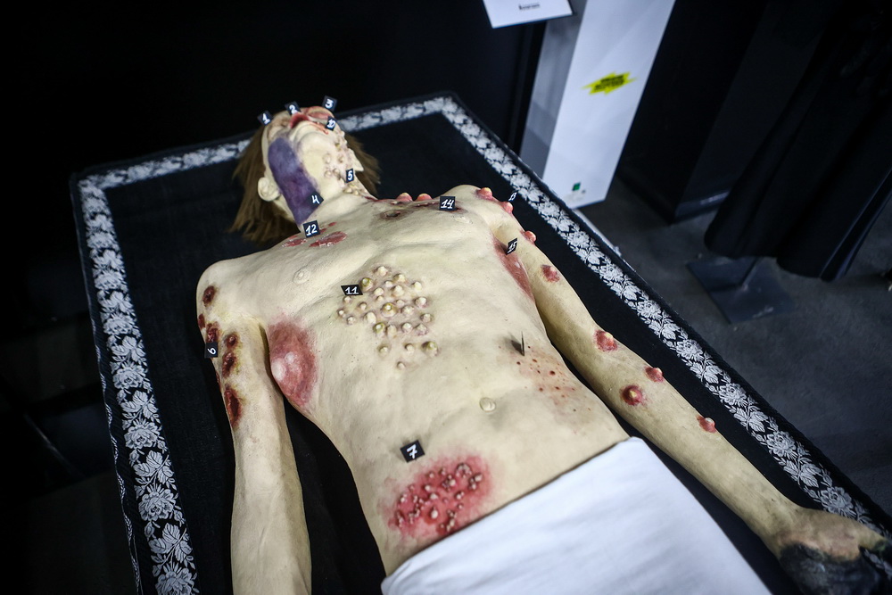 Разумеется, такого в жизни не бывает — одновременно все эпидемии, но на муляже каждая наглядно представлена. Рядом стоит чумной доктор, по соседству с ним — манекены в советских защитных костюмах.