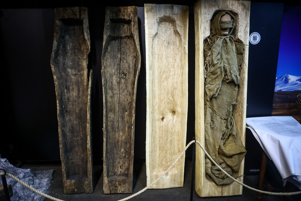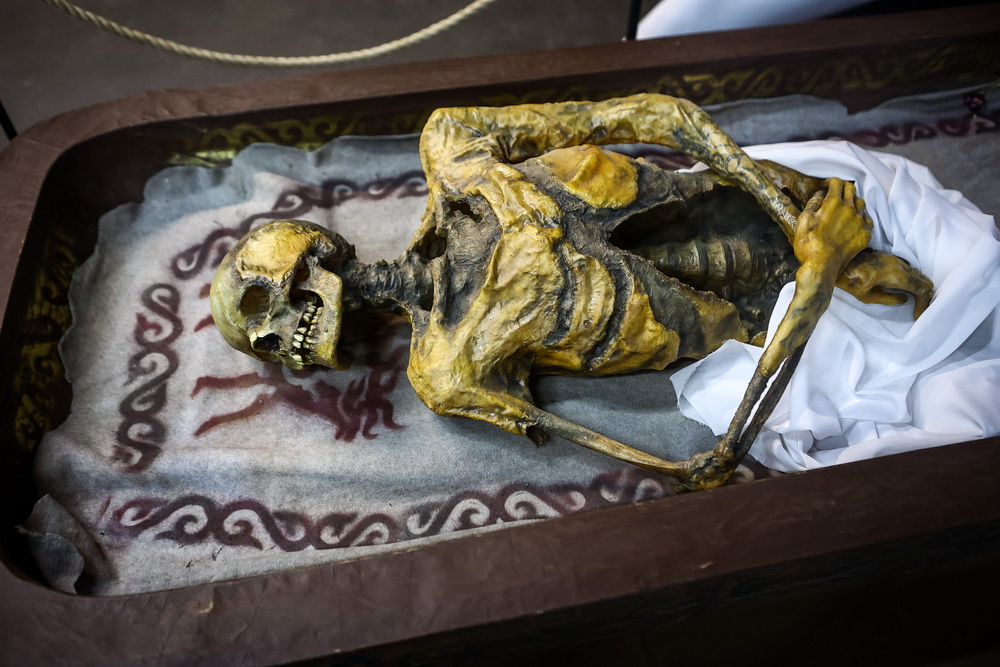Удивляет и воссозданная мумия болотного человека. Такие экземпляры часто находили в Европе. В болотах тела не разлагаются, происходит торфяное дубление. Прототип этой мумии обнаружили в Дании в 1950 году. Экспертиза показала, что человек жил в эпоху Сократа. Есть в экспозиции и копия знаменитой принцессы Укока.