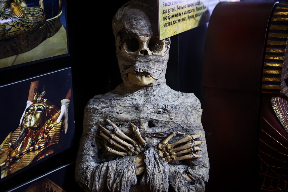 «В 2022 году мы организовали выставку мумий. Сейчас они расповсюжены по разным залам. Копия Рамзеса Великого — во втором зале. Это был выдающийся человек, дожил до 90 лет. Даже по нашим меркам это долгожитель. Среди экспонатов — копия мумии индейца Чачапойя.