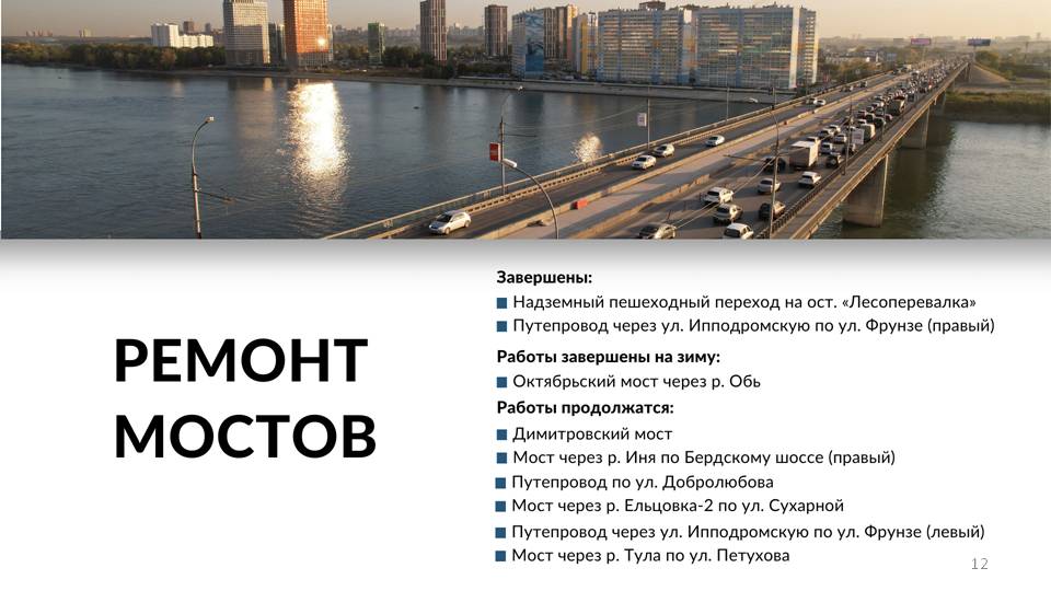 Приоритетные объекты — Октябрьский и Димитровский мосты. Столкнувшись с некачественной работой подрядчиков, отношения с ними разорвали, что осложнило ремонтные работы. До наступления зимнего периода сделали всё, чтобы запустить шестиполосное движение на обоих мостах. Работы продолжат в этом году. С профильным департаментом решили последовательно подойти к ремонту ключевых мостов. Сначала нужно отремонтировать Димитровский мост, который находится в предаварийном состоянии, а потом приступить к доработкам по Октябрьскому. Новый конкурс по Димитровскому объявили.