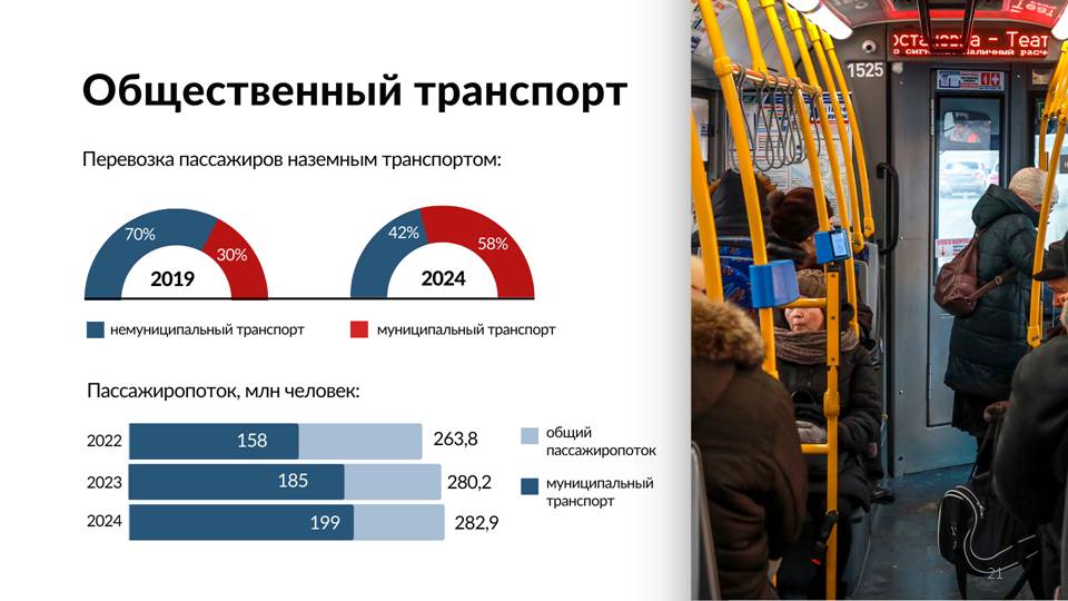 Усилия по развитию общественного транспорта приносят ощутимый результат. Увеличился объём перевозки пассажиров муниципальным наземным транспортом. А его доля в перевозке пассажиров с 2019 по 2024 год увеличилась с 30% до 58%. Это серьёзно разгружает пробки.