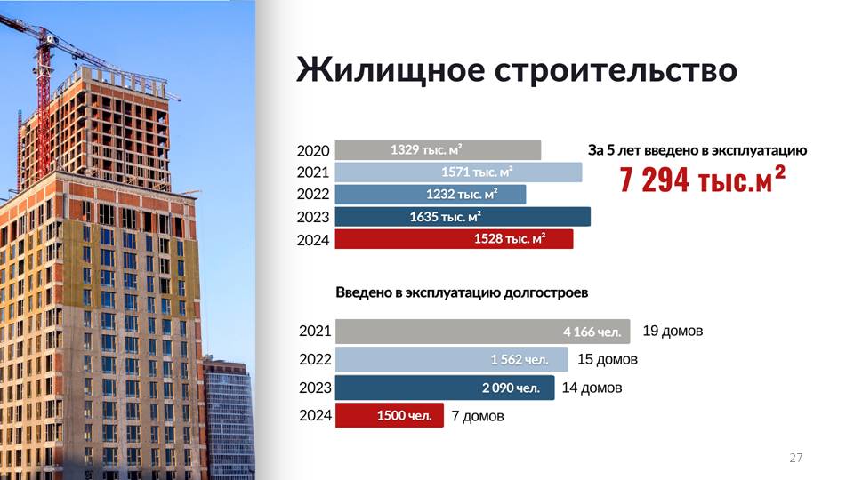 Отмечу высокие темпы ввода жилья: по итогам года сдано в эксплуатацию 1,5 млн кв. метров. Задача на 2025 год — сохранение объёмов жилищного строительства на уровне не менее 1 млн кв. метров.