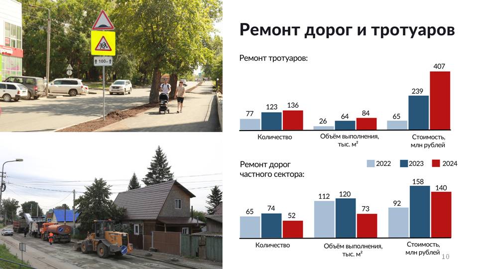 Рекордные суммы направлены на ремонт тротуаров, обновлены 136 участков. Ремонтировали дороги частного сектора: работы по всем 52-м объектам завершены вовремя. Выполнен проект по ремонту подъездных дорог к городским кладбищам.