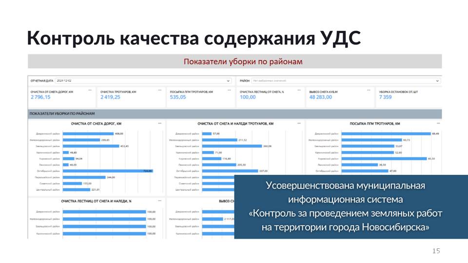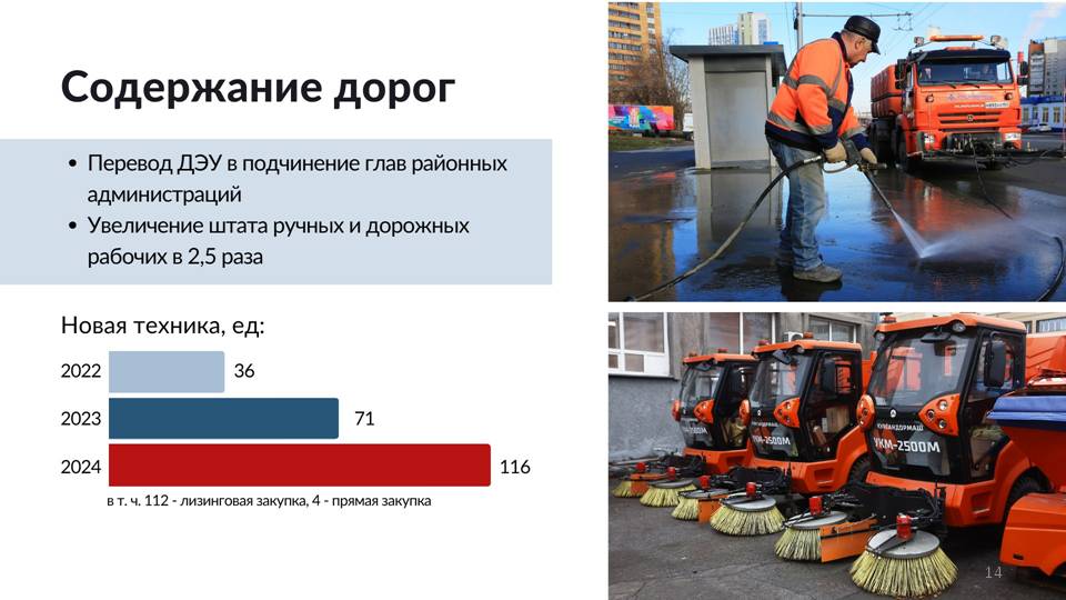 Все учреждения по обслуживанию дорог (ДЭУ) перешли в подчинение районных администраций. Теперь у глав районов есть все полномочия и ресурсы для организации комплексного подхода к содержанию и уборке территорий. В 2,5 раза увеличили штат ручных и дорожных рабочих, что позволило более оперативно решать задачи по наведению порядка. Значительно нарастили мощности для зимней уборки улиц: купили 116 единиц новой техники. Это самая крупная закупка за последние годы. 112 единиц приобрели по программе лизинга, четыре единицы — по прямым закупкам за счёт средств районов. Однако до нормативного состояния 80 единиц не хватает.