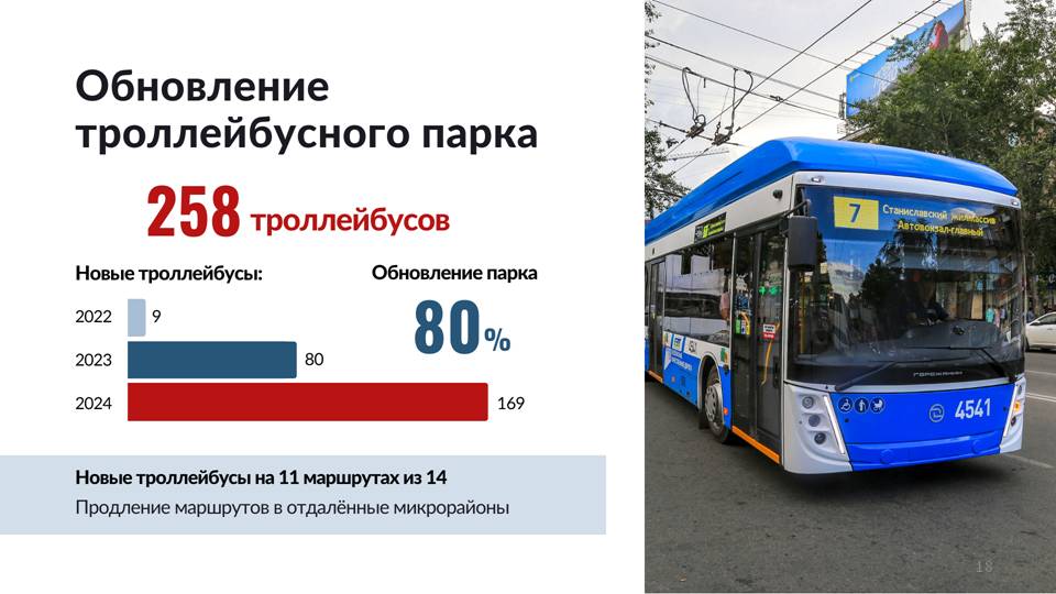 Следующее направление — развитие общественного транспорта. Высокими темпами идёт обновление подвижного состава. В прошлом году город получил 169 новых троллейбусов модели «Горожанин» с увеличенным автономным ходом. А по итогам двух лет — 258 единиц. Таким образом, троллейбусный парк обновился почти полностью: на сегодня 80% — это новые машины. Чтобы достичь 100%, потребуется вложить 2 млрд рублей. Обсуждаем этот вопрос с профильным департаментом.