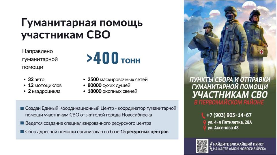 Работа ведётся в тесном сотрудничестве с правительством Новосибирской области, фондом «Защитники Отечества», воинскими подразделениями. Управлением общественных связей мэрии создана сеть единых координационных центров помощи бойцам СВО во всех районах города. В ресурсных центрах и помещениях ТОС организованы пункты сбора помощи.