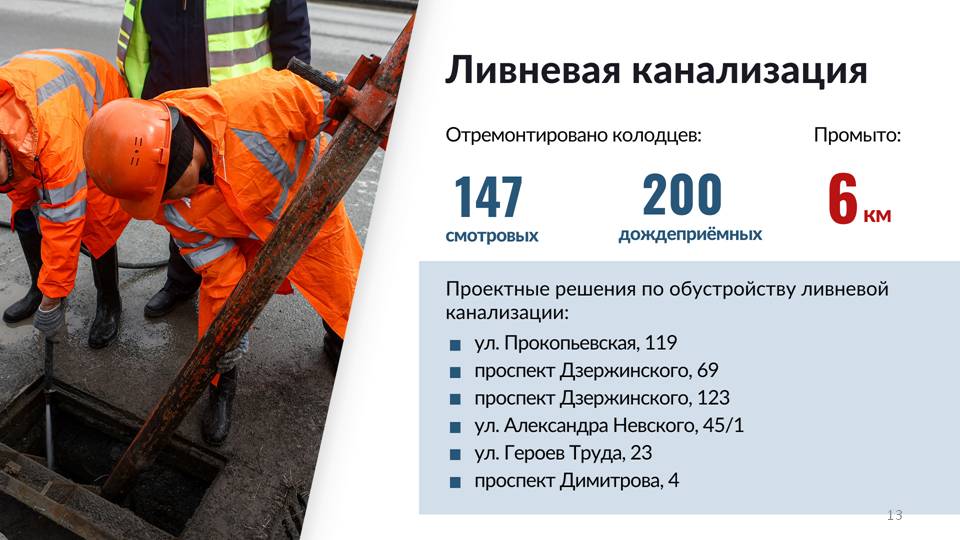 Актуальная для города задача — строительство объектов ливневой канализации, а также обеспечение текущего содержания имеющейся системы. В течение 2024 года проводились мероприятия по промывке ливнёвок, ремонту 147 смотровых и дождеприёмных колодцев. Подключены к системе отведения поверхностных сточных вод социально значимые объекты: кампус НГУ и несколько поликлиник. В этом году запланированы проектирование, строительство новых и увеличение пропускной способности существующих коллекторов.
