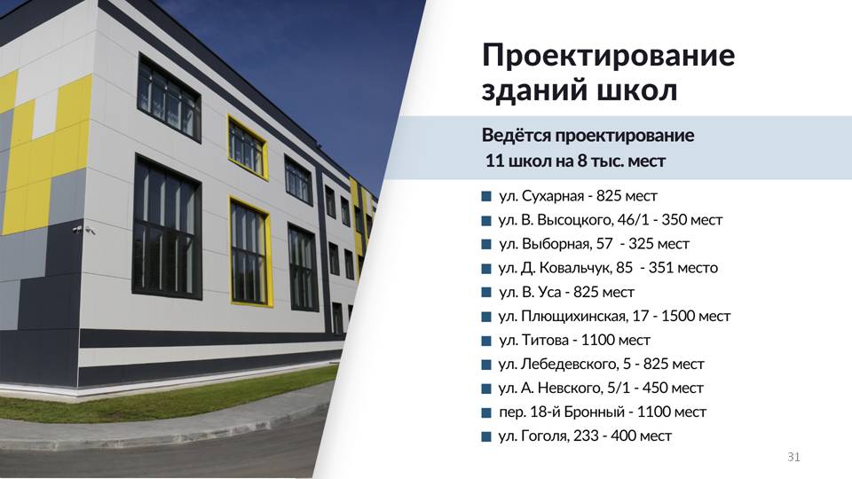 Но по-прежнему острой остаётся проблема дефицита школьных мест в быстрорастущих микрорайонах. Идёт проектирование 11 школ общей вместимостью более 8000 детей.
