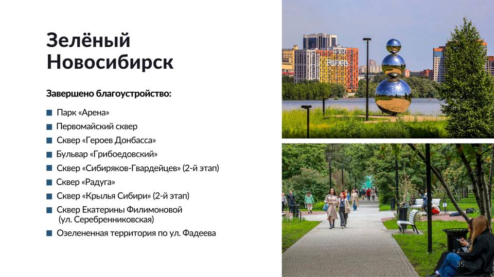 Благоустроены Первомайский сквер, сквер Героев Донбасса, бульвар Грибоедова и ряд других зелёных зон. Мы распределяем парковые зоны равномерно по городу, чтобы у жителей была возможность отдохнуть рядом с домом.