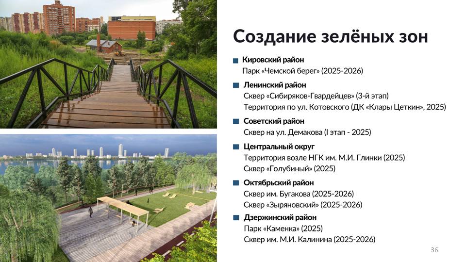 В этом году предстоит завершить благоустройство сквера Сибиряков-Гвардейцев и приступить к созданию скверов на улице Демакова в Советском районе и имени Бугакова в Октябрьском районе. Планируются работы на территории бывшего ДК имени Клары Цеткин. Кроме того, должны завершить парк «Каменка» и сквер имени Калинина.