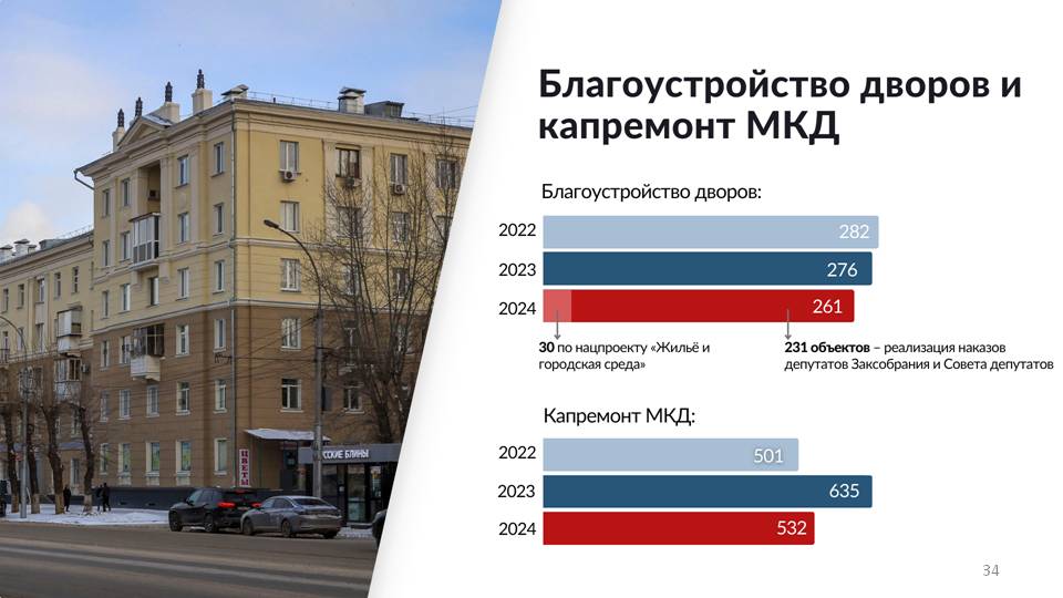 Повышенное внимание уделяем задаче формирования комфортной городской среды. В 2024 году по наказам избирателей благоустроена 231 дворовая территория, ещё 30 — в рамках проекта «ФКГС». Выполнен капремонт 532 многоквартирных домов.