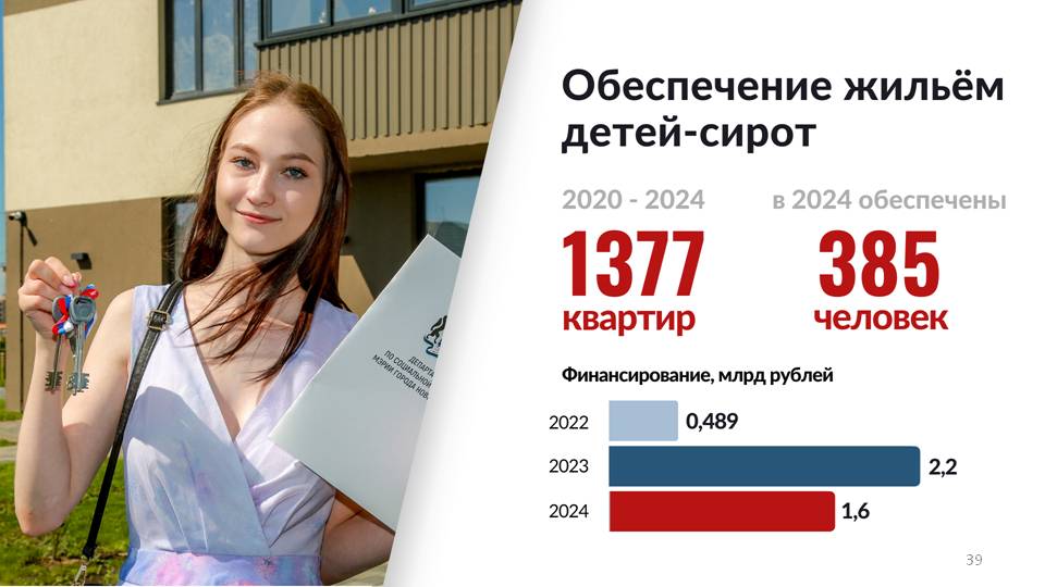 Продолжаем системную работу по обеспечению жилыми помещениями детей-сирот. За годы работы по этому направлению принят ряд эффективных управленческих решений, позволивших качественно изменить организацию этой деятельности. В результате в несколько раз выросли темпы покупки жилья. Всего за период с 2020 по 2024 год жильём обеспечены 1377 детей-сирот. Задача 2025 года — обеспечить жильём не менее 460 человек.