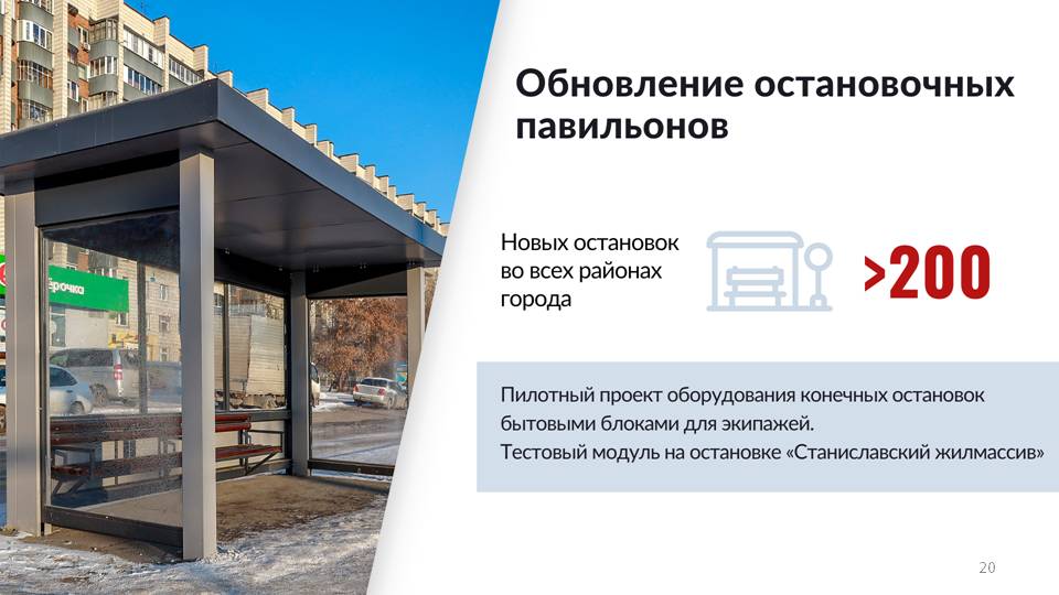 Решается острейшая для новосибирцев проблема изношенных остановочных платформ. Обновлено порядка 200 павильонов. Приступили к обустройству конечных пунктов остановками с помещениями для отдыха водителей и кондукторов. Первый такой модуль поставили на конечной «Станиславский жилмассив». 19 остановочных павильонов нам установил бизнес, затраты бюджета — ноль.