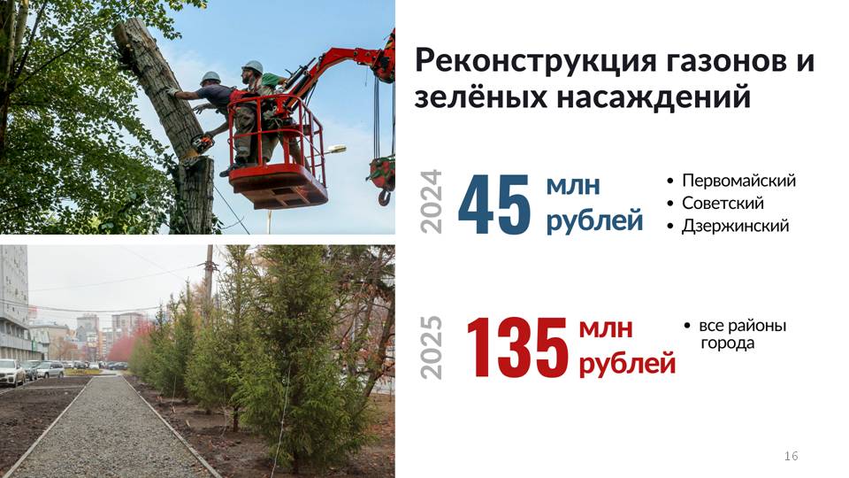 Мы проанализировали причины появления пыли в городе и выяснили, что это, в частности, некачественные газоны. Реализован пилотный проект по комплексной реконструкции и содержанию газонов, расположенных вдоль автомобильных дорог, на территории Дзержинского, Советского и Первомайского районов. В этом году выходим на более объёмную программу, в бюджете предусмотрено финансирование на эти цели для всех районов города.