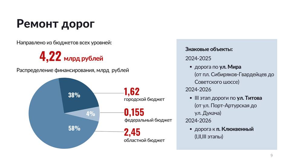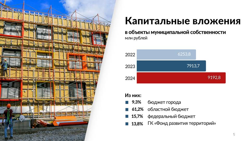 Приоритеты бюджетной политики остаются прежними — это безусловное выполнение социальных обязательств, максимальное участие в национальных проектах, региональных и федеральных программах. В отчётном году в развитие инфраструктуры города направлено свыше 9 млрд рублей.