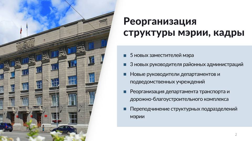 Обновлена существенная часть управленческого звена. Проводим реорганизацию в дорожно-транспортном блоке: приняли решение разделить департамент транспорта и дорожного комплекса на два ведомства. Одно будет заниматься дорогами и благоустройством, другое — общественным транспортом. Завершится процесс в феврале.