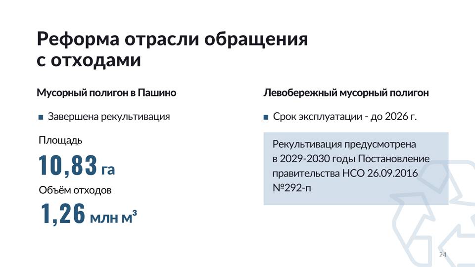 По реализации реформы обращения с отходами: в прошлом году завершена рекультивация мусорного полигона в Пашино. Следующая задача — Левобережный мусорный полигон. Он практически полностью исчерпал свой ресурс, эксплуатация площадки разрешена до 2026 года.