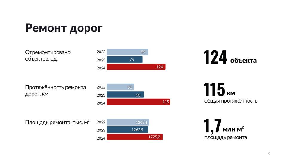 В 2024 году программа дорожного ремонта реализована успешно, объём работ был беспрецедентный. В целом отремонтировано почти 115 километров дорог — это на 70% больше ремонтной программы предыдущего года (67,6 км).