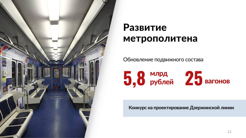 Благодаря помощи областного бюджета приступили к решению актуальной задачи обновления подвижного состава метрополитена. Заключены договоры на приобретение пяти пятивагонных составов. Первую партию вагонов ждём в ноябре 2025 года. К 2030 году мы должны полностью обновить подвижной состав метро.