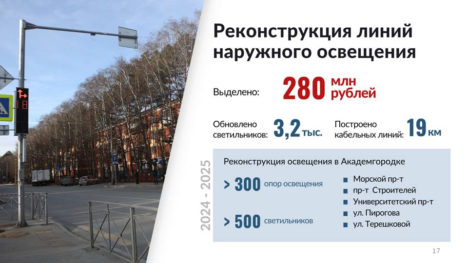 По ремонту освещения в городе: проводились работы по строительству новых линий, заменили 3200 светильников. Сконцентрированно провели эту работу в Академгородке. Объём работ большой, в этом году планируем их завершить. Впервые в таком масштабе реализуем принцип «Чистое небо»: предусмотрено обустройство кабельной канализации, это улучшит облик района.