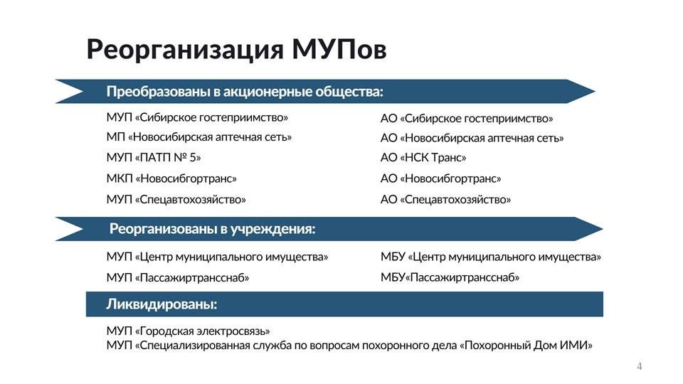 В прошлом году завершены все мероприятия по реорганизации МУПов. В результате у города осталось семь муниципальных предприятий и появилось пять акционерных обществ. Сохранены все жизненно важные для Новосибирска предприятия. Предстоит нарабатывать практику взаимодействия с акционерными обществами, настраивать под них нормативную базу, курировать их деятельность через совет директоров. Два учреждения реорганизованы в МБУ.
