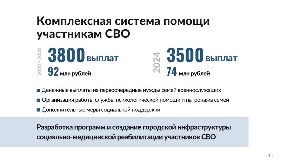 Безусловный приоритет — поддержка военнослужащих и членов их семей. Выстроена комплексная система помощи участникам СВО, каждой семье обеспечивается индивидуальный подход. Задействованы все структурные подразделения социальной отрасли.
