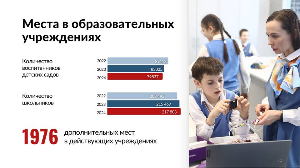 Продолжаем работу по формированию дополнительных мест за счёт внутренних резервов и оптимизации помещений. В прошлом году создано 1976 мест в действующих учреждениях, а всего с учётом строительства новых зданий — 3776.