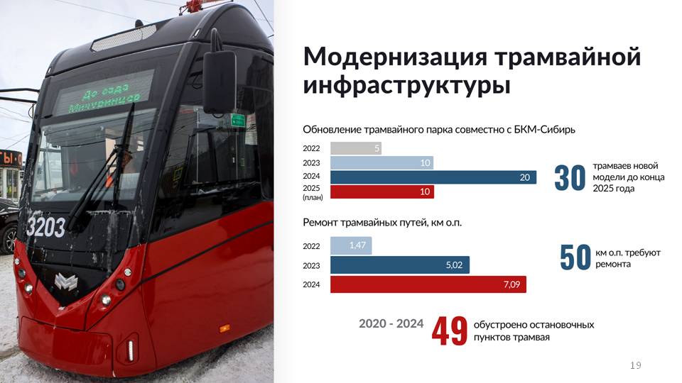 Вместе с Беларусью продолжаем модернизацию трамваев. В прошлом году приобрели 20 вагонов новой модели. Они вышли на 13-й маршрут. Отдельного внимания требует развитие рельсовой инфраструктуры. В прошлом году провели обновление трамвайных путей на улице Мира. Там осталось сделать венские платформы с удобным подходом.