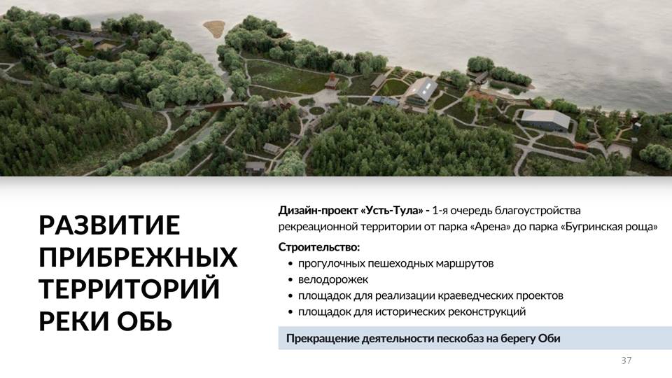 Ещё один амбиционный проект на левом берегу Оби — парк «Усть-Тула». Сейчас разработчики готовят дизайн-проект для его первой очереди с учётом замечаний и предложений, высказанных жителями на общественных обсуждениях.