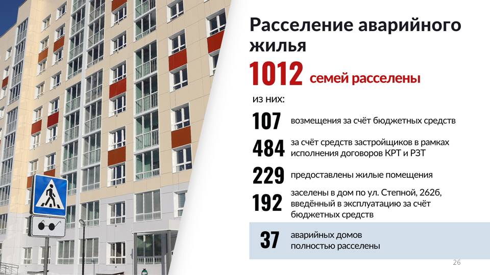 Всего на сегодняшний день на территории города 498 многоквартирных домов признаны аварийными и подлежащими сносу. К ликвидации ветхого жилого фонда привлекаются средства застройщиков по проектам КРТ, которое становится основным вектором жилищного строительства в городе. В прошлом году достигли высоких результатов.