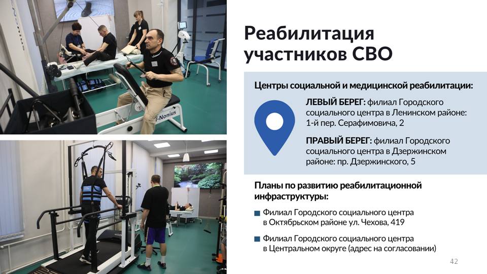 Отдельное направление деятельности — создание инфраструктуры социально-медицинской реабилитации участников СВО. В 2023 году центр реабилитации открылся в Ленинском районе. Ещё одно учреждение появилось в Дзержинском районе. Аналогичные отделения в Центральном округе и Октябрьском районе готовятся к открытию в этом году.