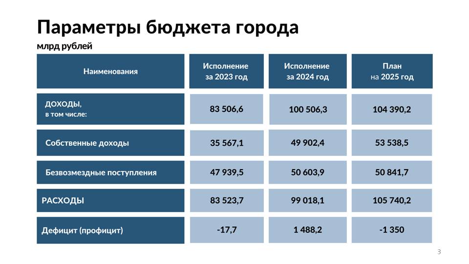 Бюджет Новосибирска впервые преодолел рубеж в 100 млрд рублей. Предварительные итоги исполнения за 2024 год представлены на слайде. Существенно увеличились собственные доходы. Значительные суммы привлекаются из вышестоящих бюджетов: межбюджетные трансферты превысили 50 млрд рублей — это максимальный объём за все прошлые годы. Это результат совместной работы мэрии, областного правительства и депутатов.