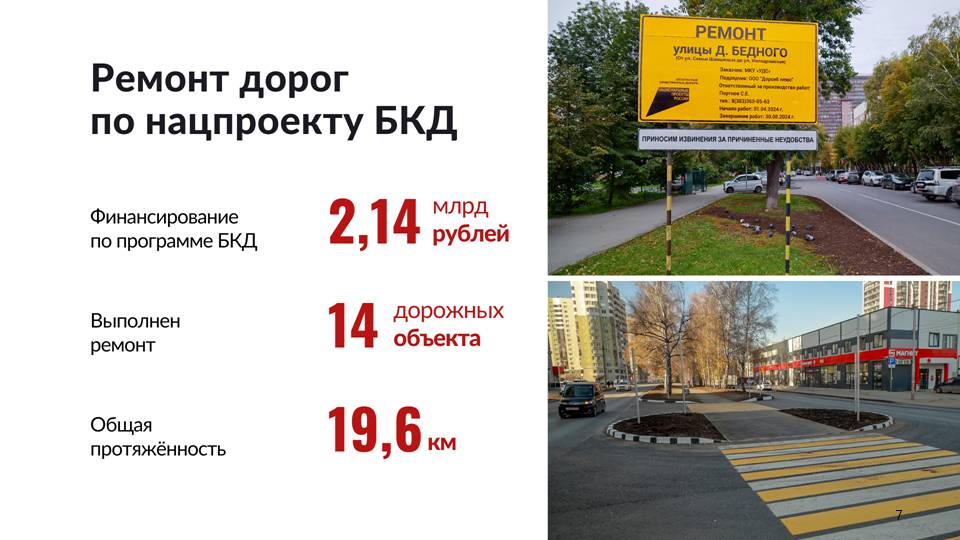 Приоритетом стал комплексный ремонт, включая замену бордюров, обновление тротуаров, устройство газонов, дорожных знаков и разметки. Общая площадь ремонта составила более 1,7 млн кв. метров.