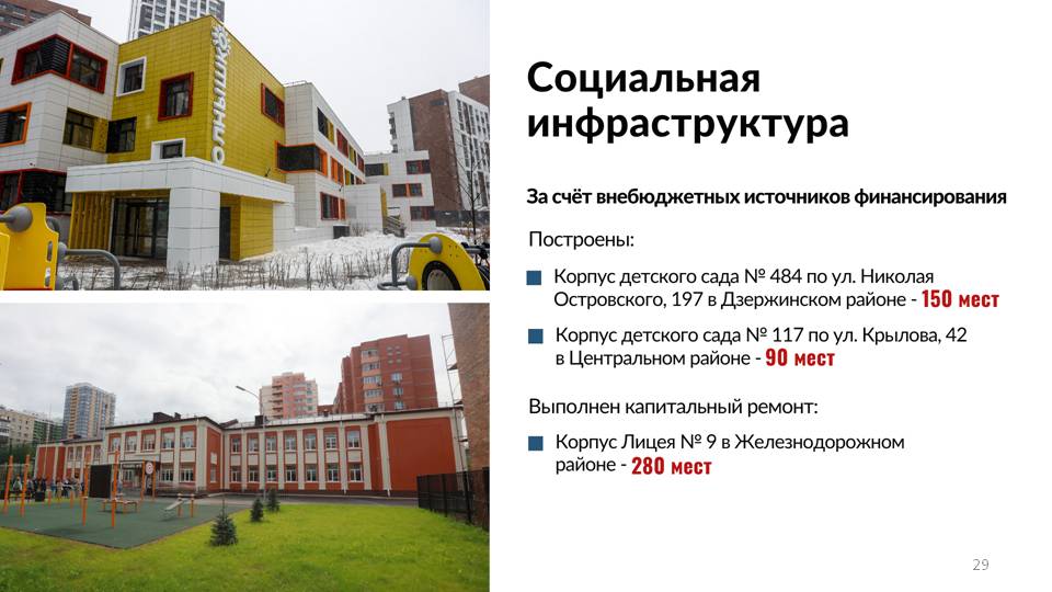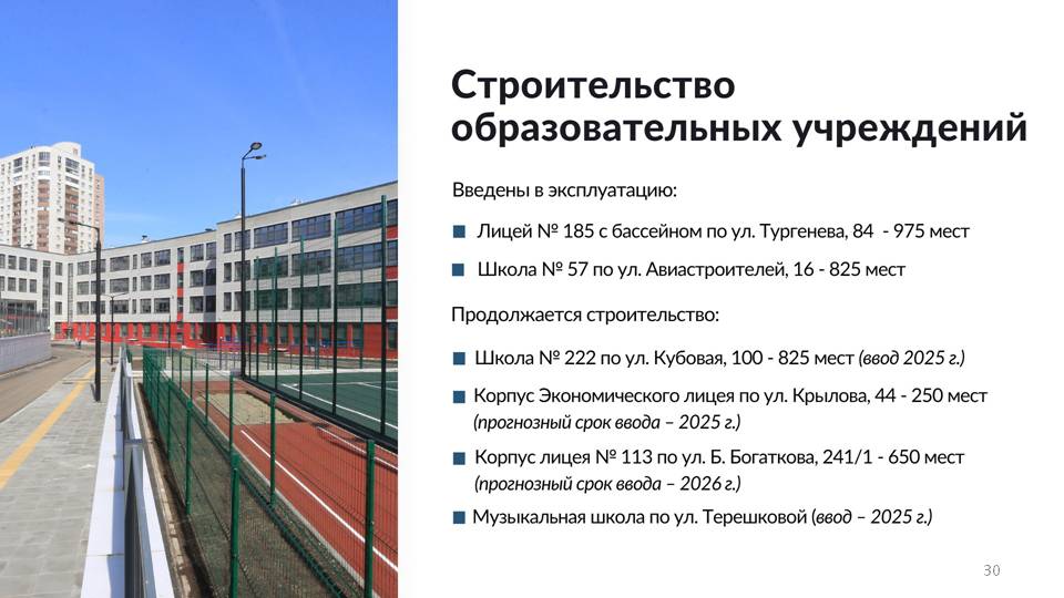 Введены в эксплуатацию две школы: лицей №185 в Октябрьском районе и школа №57 в Дзержинском районе, в январе 2025 года она приняла учеников.
