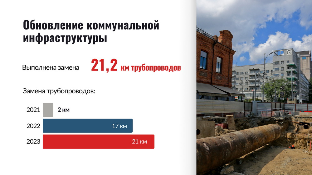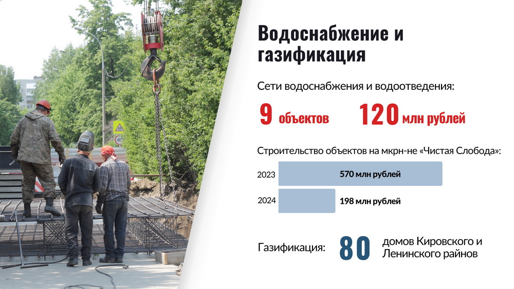 Что касается сетей водоснабжения и водоотведения, выполнены строительство и реконструкция девяти объектов на сумму 120 млн рублей, включая строительство первого этапа водопровода на улице Балластной в Ленинском районе. В микрорайоне «Чистая слобода» за счёт средств областного бюджета в 2023-2024 годах строят два объекта муниципального предприятия «Горводоканал».