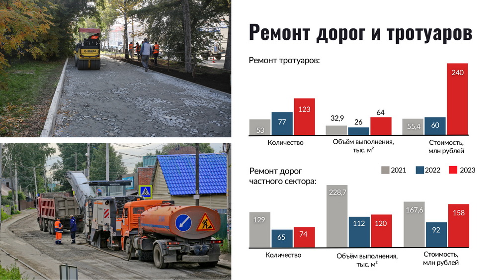 Продолжается ремонт тротуаров. Эту работу начинали с небольших объёмов — насколько это позволял бюджет. В 2023 году заложили больше средств, получили существенную финансовую поддержку области. В результате на 240 млн рублей обновили 123 объекта. Это рекордный объём. В этом году запланировано 300 млн рублей. Перечень участков, как и прежде, будет формироваться с учётом предложений депутатов.